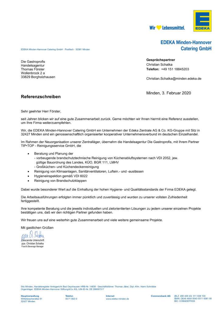 In einem offiziellen Referenzschreiben bescheinigt uns die EDEKA Minden-Hannover Catering GmbH: